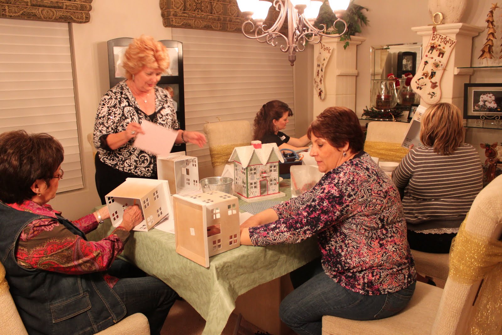Monday night we had our annual weSTAMP Christmas party!! What a great time we all had! Paper crafting, yummy food, wonderful friends, and a gift exchange that was amazing! Rachele Sanclemente is the amazing gal behind the scenes. She came up with this Christmas project for our group. She has been working on this for weeks, pulling together all the details to make this project happen! THANK YOU RACHELE!!! I am so appreciative for you and all your hard work. It was such a fun, festive Christmas project! Rachele made 3 different houses to show us many different options that we could make. (We all got to create a house made out of the largest size.)